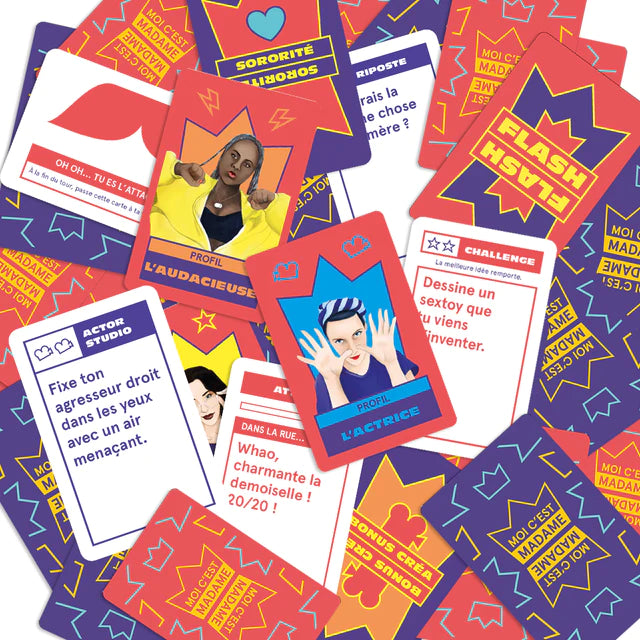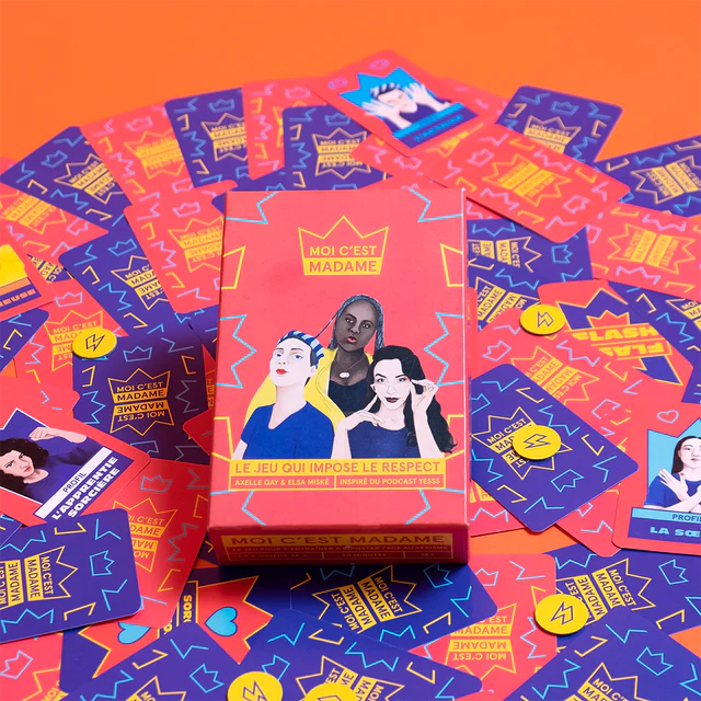 Moi c'est Madame comporte 220 cartes d'attaques et de ripostes pour combattre les stéréotypes de genre. Vous y trouverez aussi des défis, des challenges et plein de surprises pour passer un bon moment entre ami.e.s.